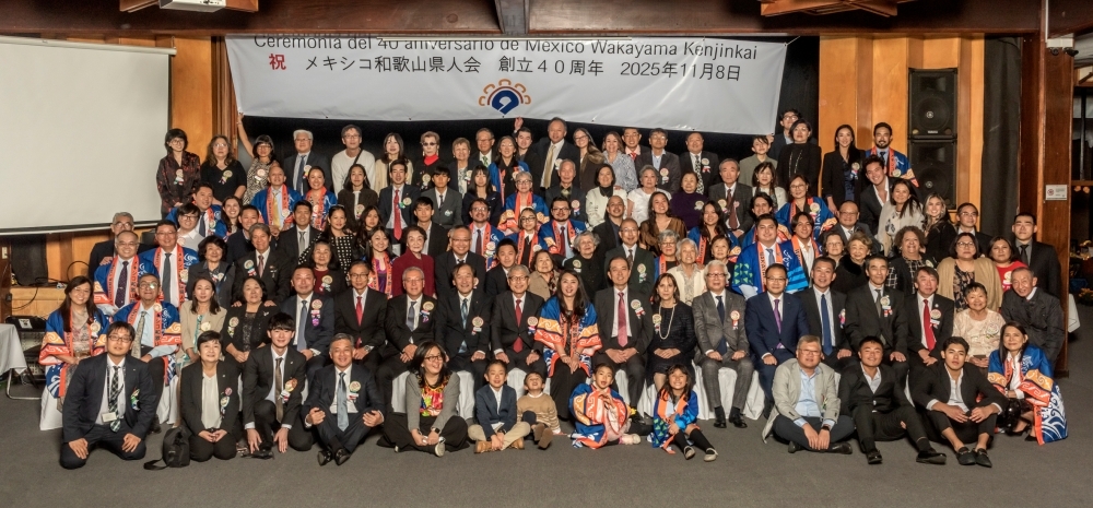 メキシコ和歌山県人会は、1985年に発足し今年で40周年を迎えました。日本から、宮崎泉和歌山県知事、岩田弘彦和歌山県議会議長など和歌山県一行が出席し、式典では来賓の方々からメキシコと和歌山県のこれまでの交流の歴史が紹介されました。また、メキシコ料理とマリアッチ演奏、メキシコの歌唱の紹介を通じ和歌山県から来墨した方々を歓待するなど、終始活気のある式典となりました。