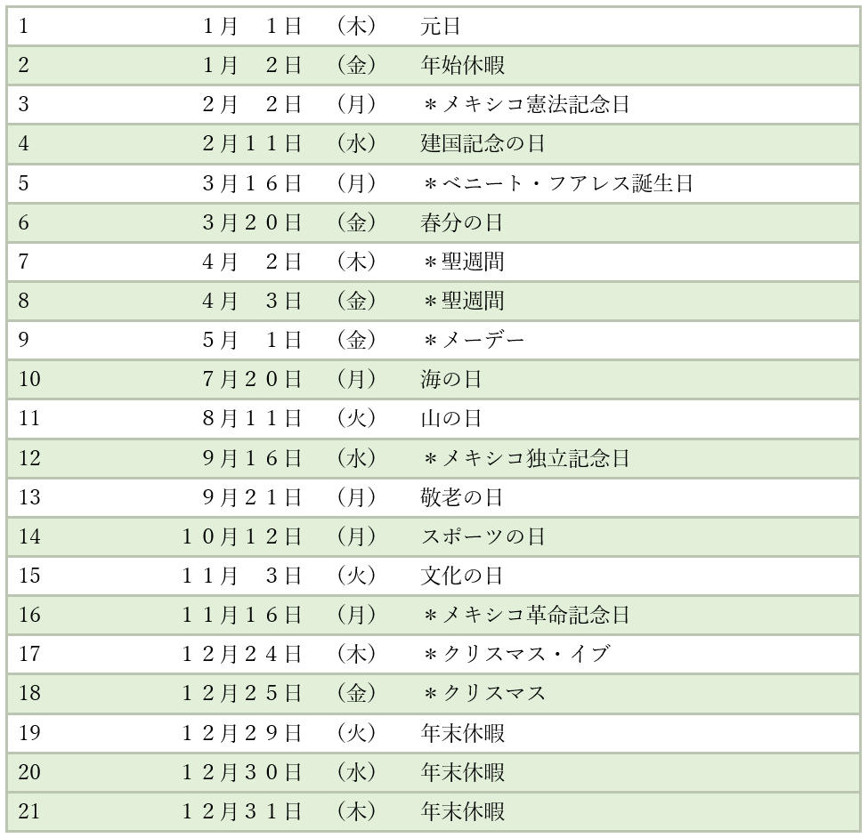 2026年の休館日について(2025年11月28日) 令和7年11月28日 Español(スペイン語版) 2026年の在メキシコ日本国大使館の休館日を以下のとおりお知らせいたしますので、ご来館される際はご留意願います。 合計21日 (*印はメキシコの祝祭日) (注)「行政機関の休日に関する法律」に基づき,在外公館は土曜日及び日曜日以外に2026年は21日間の休館日を定めることになっております。